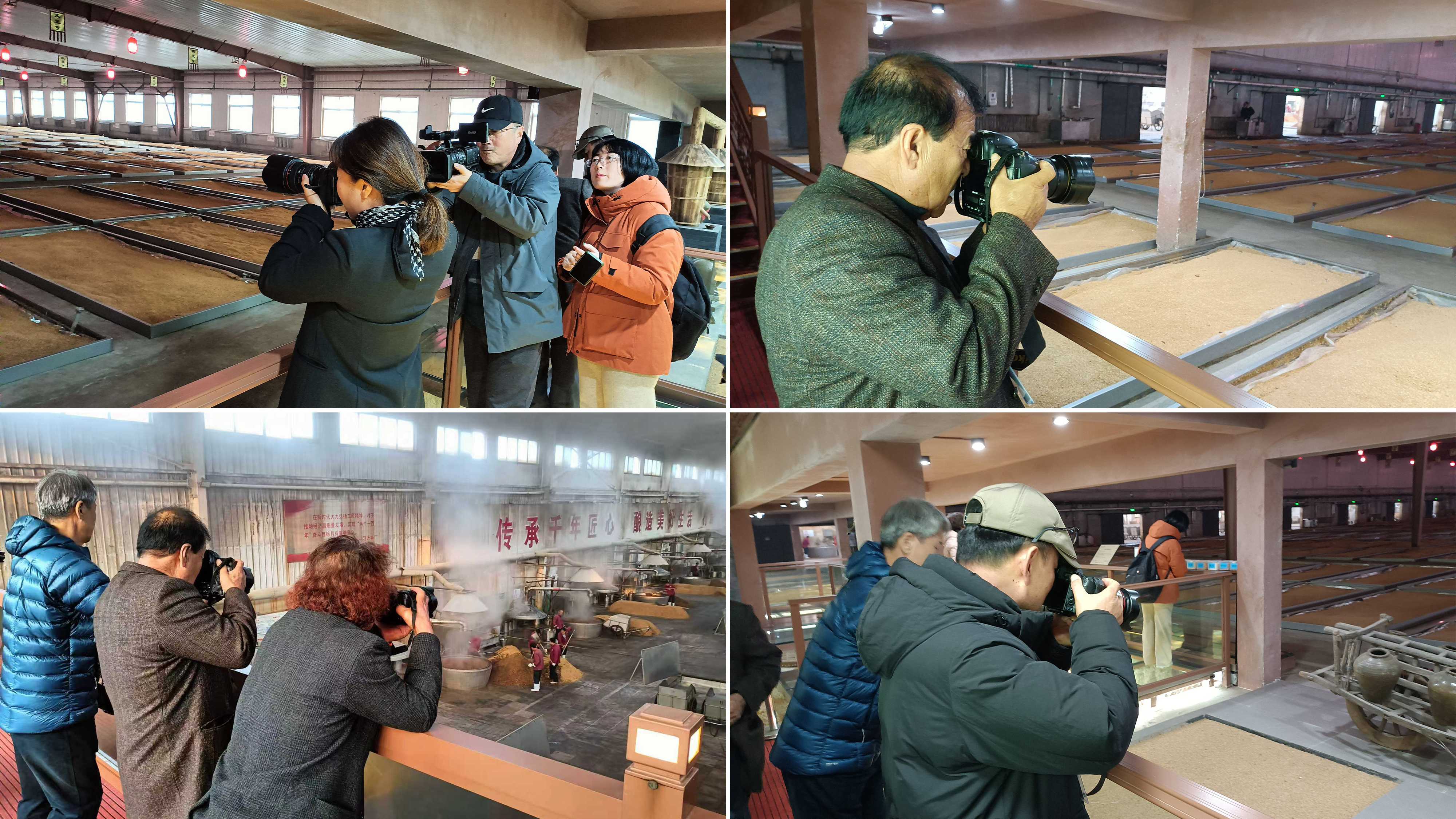 随后,中韩摄影家们先后参观了千亿国际烧锅酒博物馆与生产厂区,深入了解了从选粮、发酵、蒸馏到陈酿的全流程工艺。摄影家们穿梭于古朴的窖池与现代生产线之间,不断按下快门,记录下工人劳作的身影、蒸汽氤氲的车间场景,以及充满岁月痕迹的酒器文物。光影交错间,北方白酒酿造的文化底蕴与工业美学被一一凝固定格。